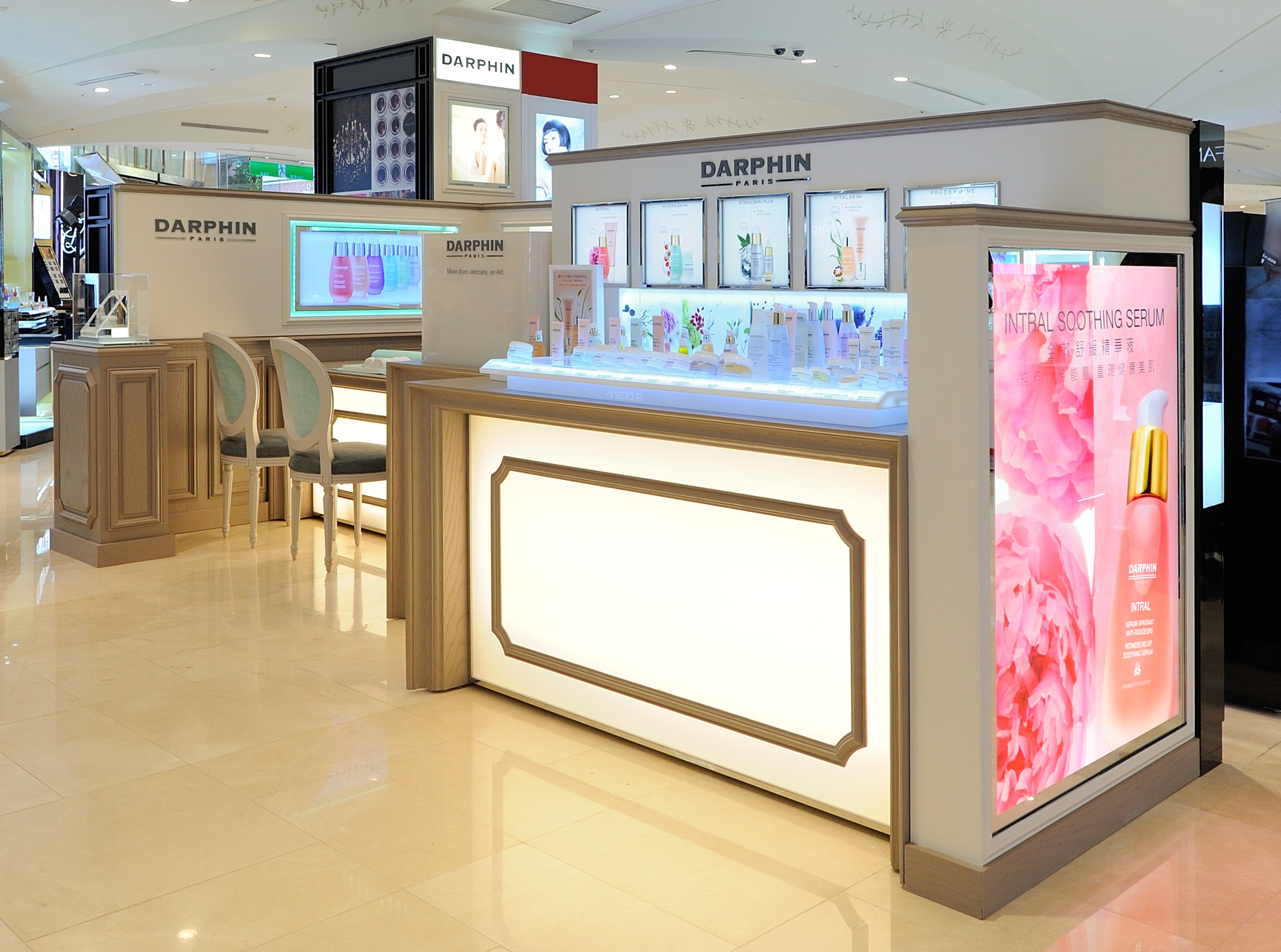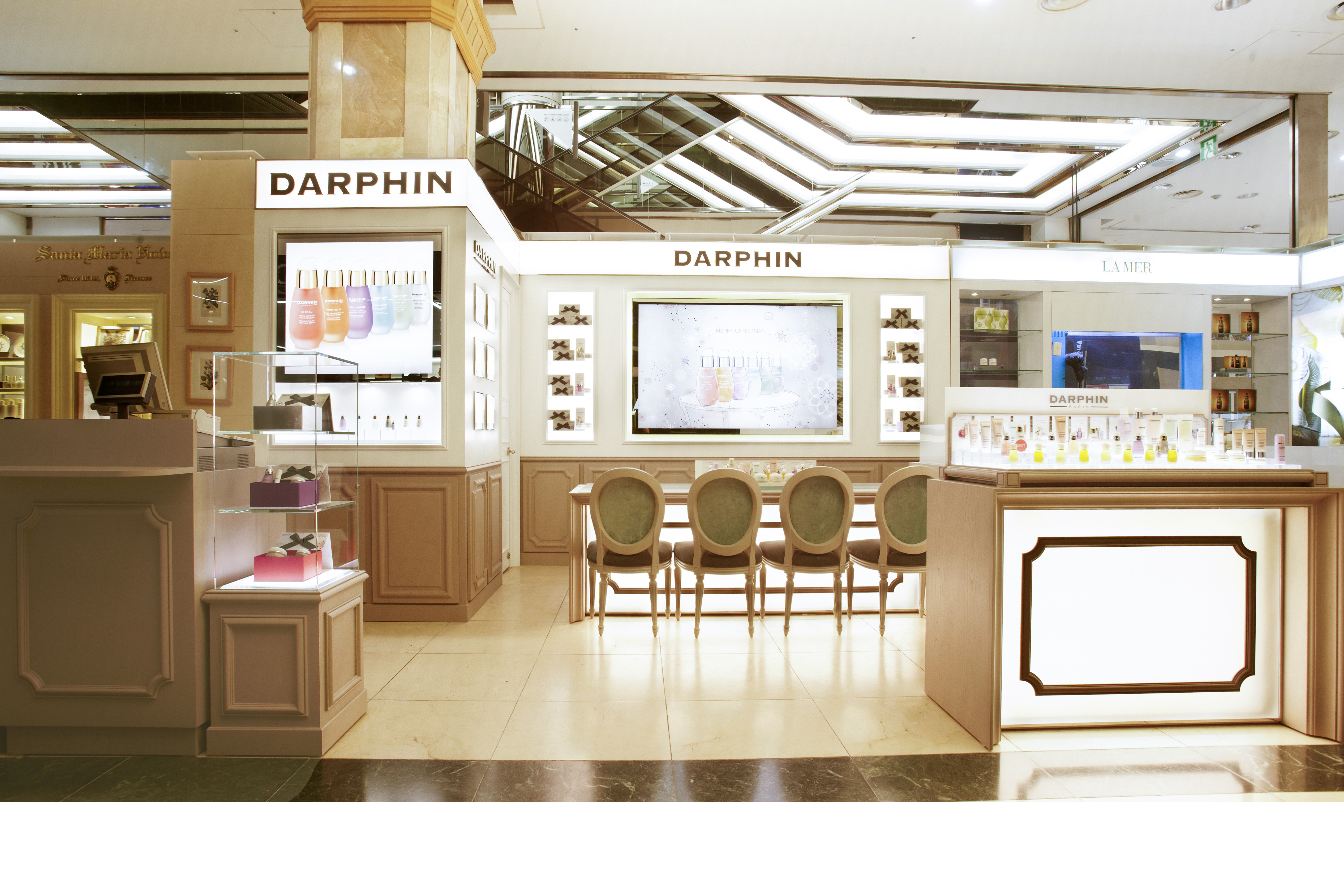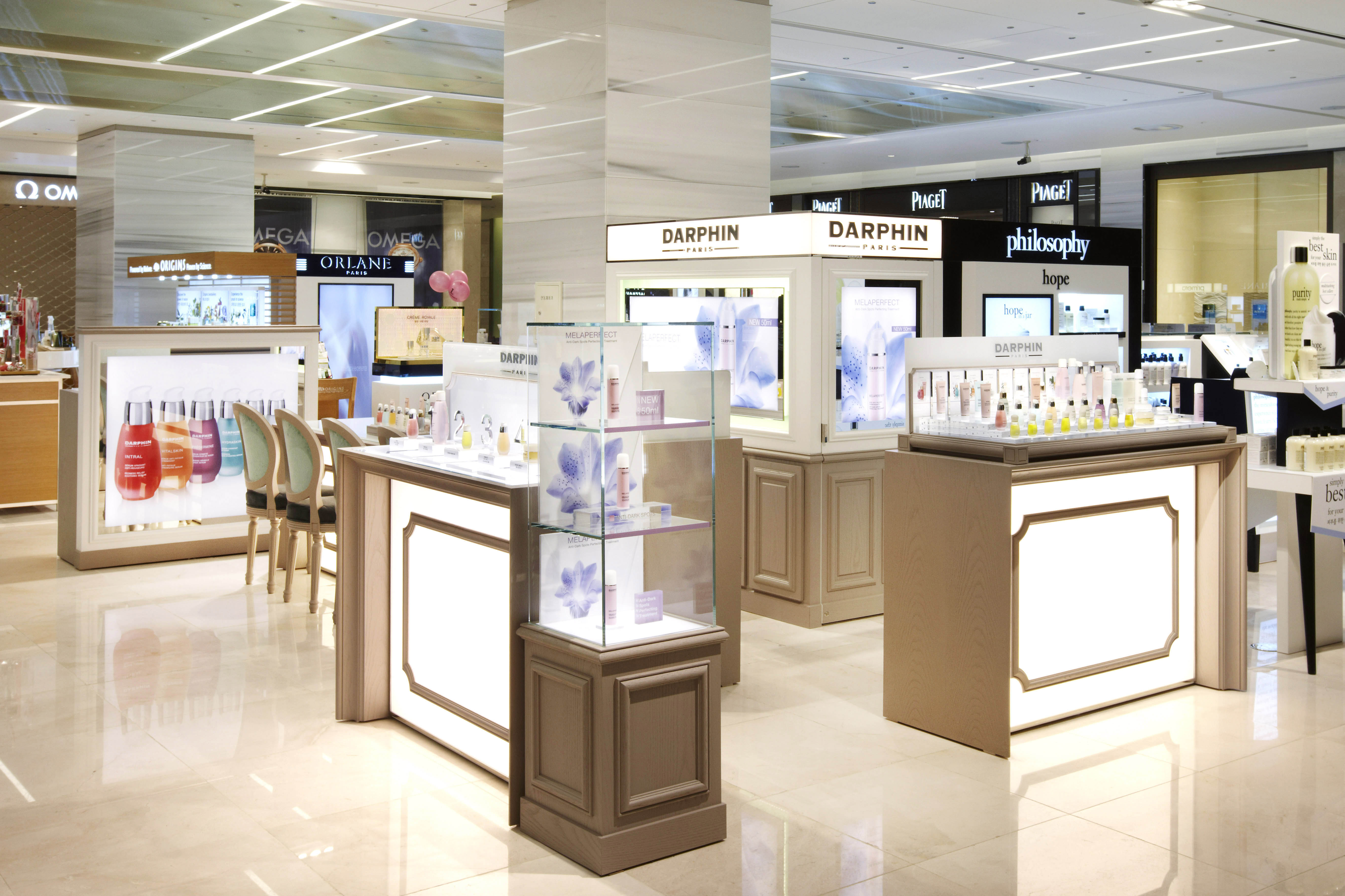 Afin de repositionner cette marque de soins du groupe Estée Lauder, j’ai créé pour Darphin un style et son concept avec une agence de design ; déploiement de ce style dans les points de vente à l’international dans un premier temps, puis dans le flagship l’Institut rue Saint Honoré à Paris. Ensuite les bureaux parisiens ont également été relookés afin de conserver cette cohérence de l’image de la marque.