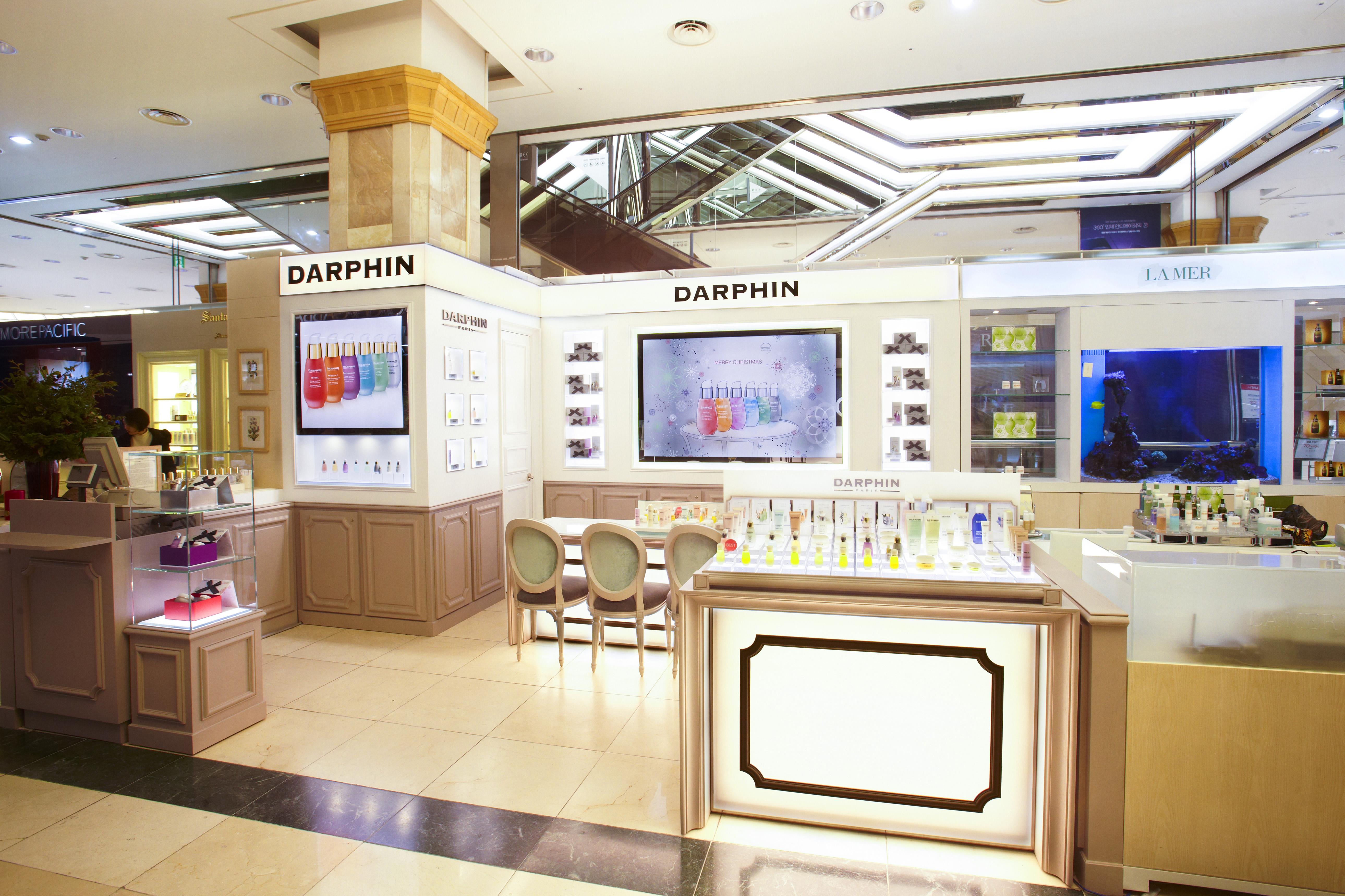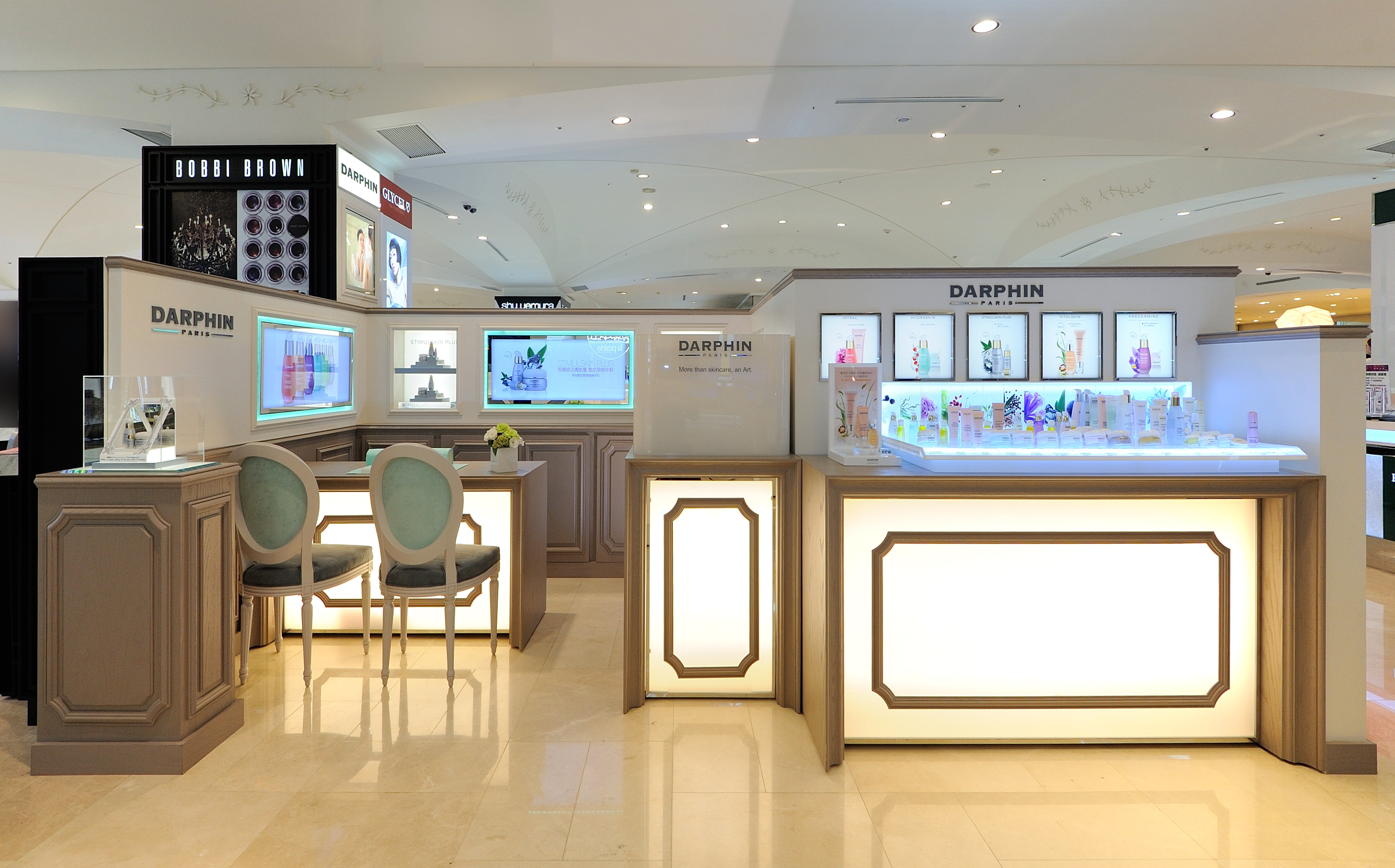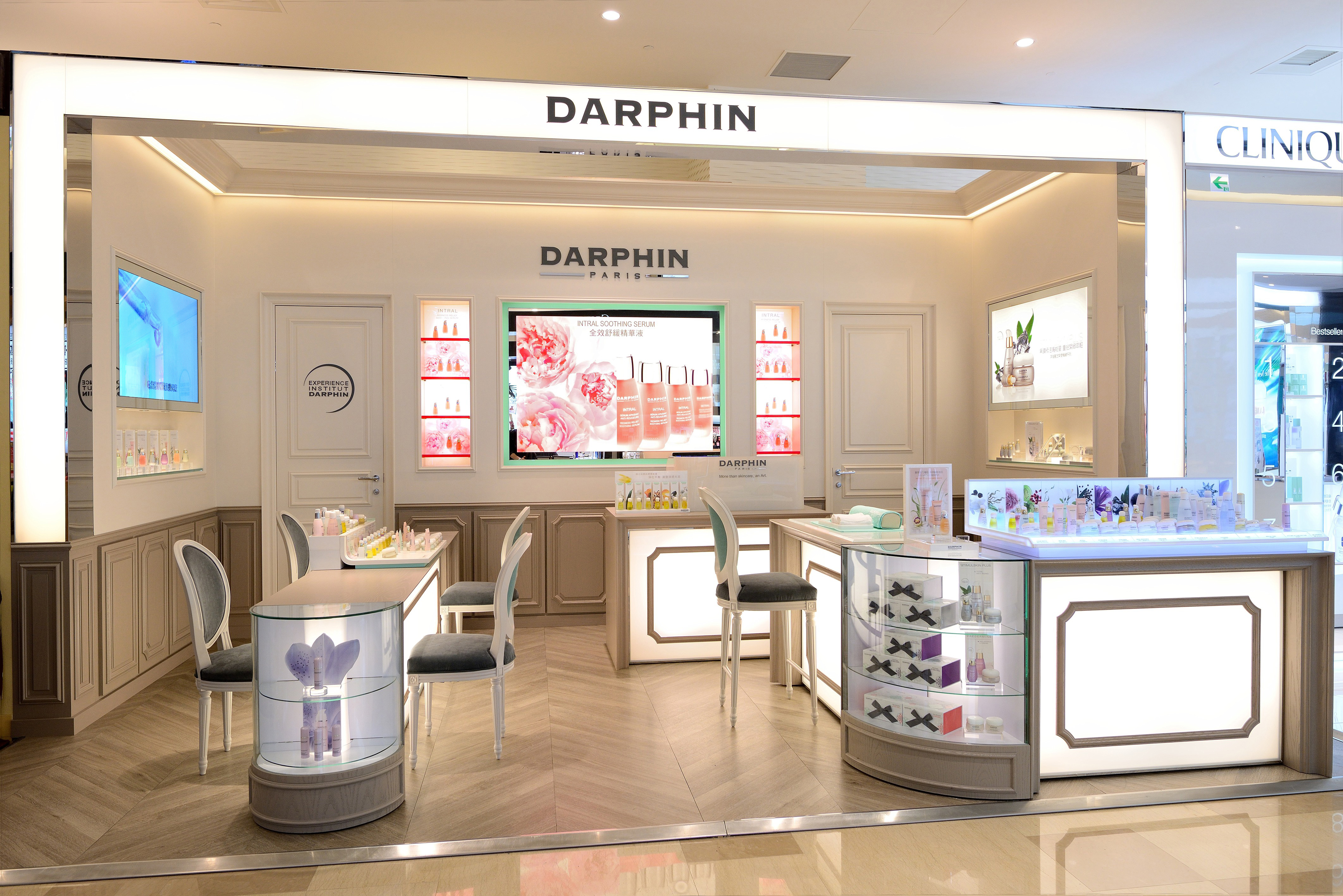 Afin de repositionner cette marque de soins du groupe Estée Lauder, j’ai créé pour Darphin un style et son concept avec une agence de design ; déploiement de ce style dans les points de vente à l’international dans un premier temps, puis dans le flagship l’Institut rue Saint Honoré à Paris. Ensuite les bureaux parisiens ont également été relookés afin de conserver cette cohérence de l’image de la marque.